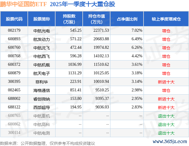 从基金规模来看,鹏华中证国防ETF基金2025年一季度公布的基金规模为31.89亿元,较上一期规模29.63亿元变化了2.26亿元,环比变化了7.63%。该基金最新一期资产配置为:股票占净值比98.39%,无债券类资产,现金占净值比1.84%。从基金持仓来看,该基金当季前十大股票仓位达42.88%,第一大重仓股为中航光电(002179),持仓占比为7.02%。